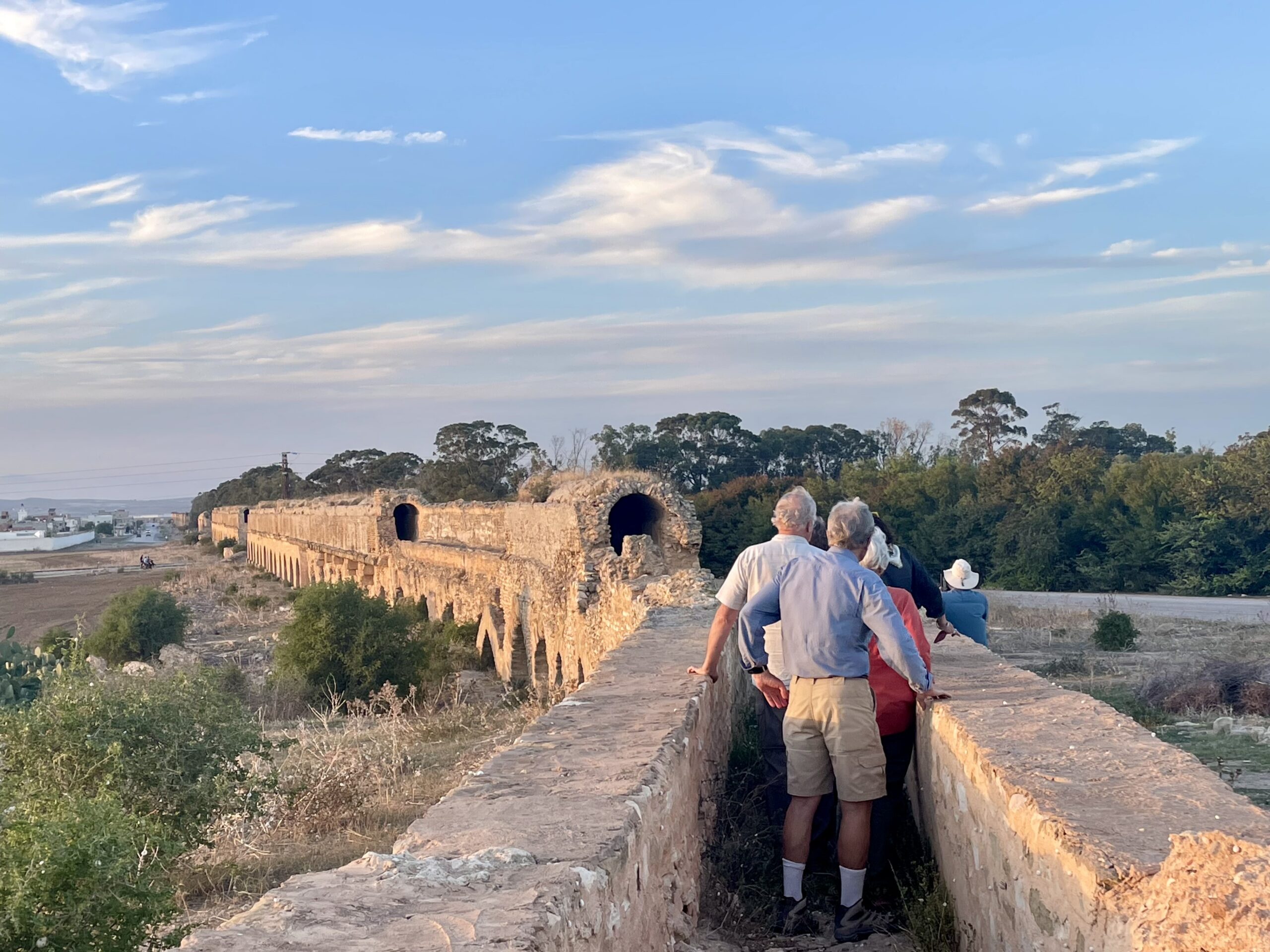 guests exploring a Roman aqueduct at dusk in Tunisia